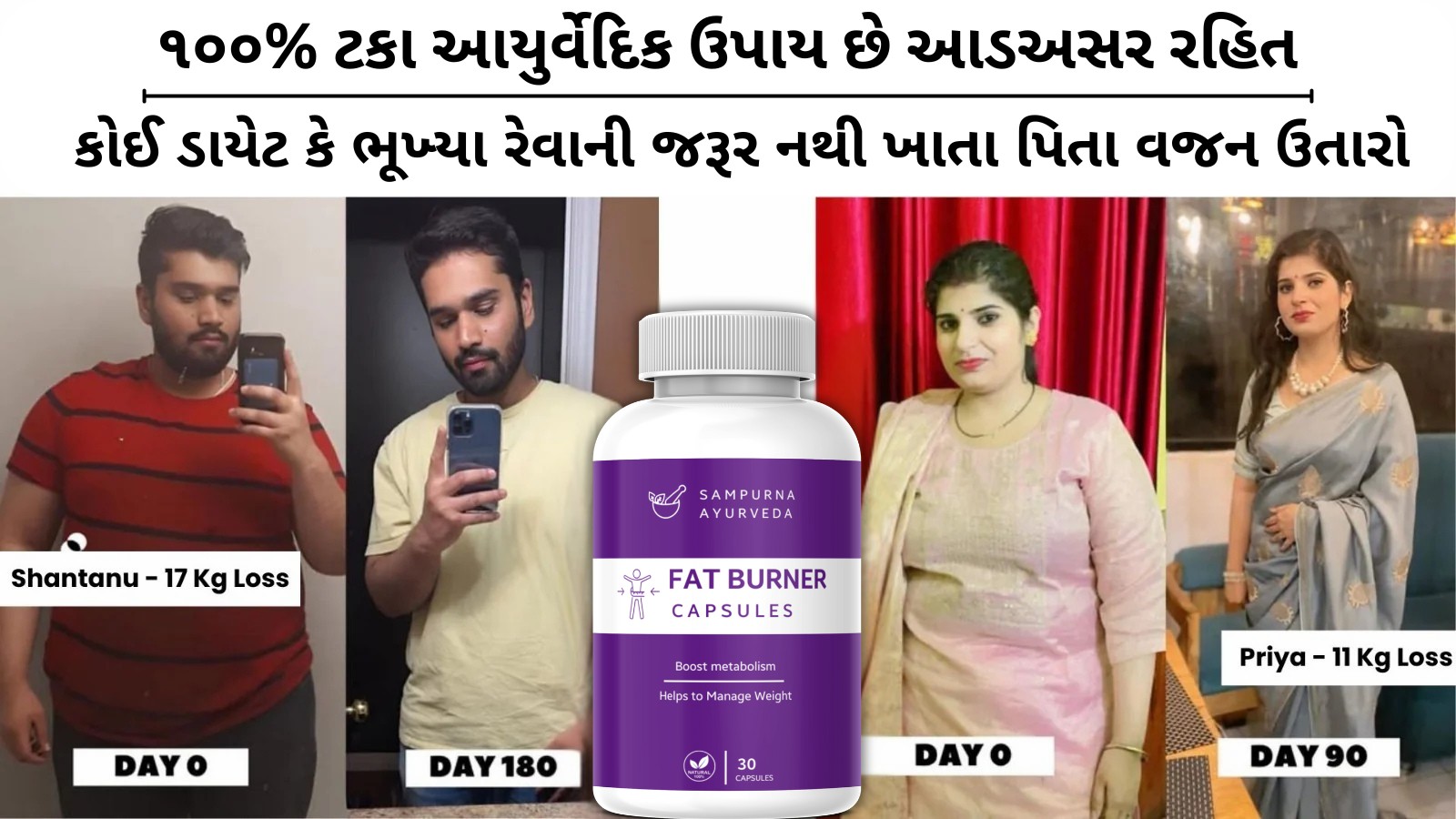 જો તમે પણ આ જ સમસ્યાઓ સાથે ઝઝૂમી રહ્યા છો, તો Fat Burner તમારી મદદ કરી શકે છે. Fat Burner સંપૂર્ણ રીતે કુદરતી અને આયુર્વેદિક સોલ્યુશન છે, જે વજન ઘટાડવાની પ્રક્રિયાને સરળ અને અસરકારક બનાવે છે. તેનો વિશેષ ફોર્મ્યુલા ઝડપથી ચરબી બર્ન કરે છે અને મેટાબોલિઝમને બૂસ્ટ કરે છે, જેથી તમે કોઈ વધારાની મહેનત વિના તમારા વજનને નિયંત્રિત કરી શકો છો.